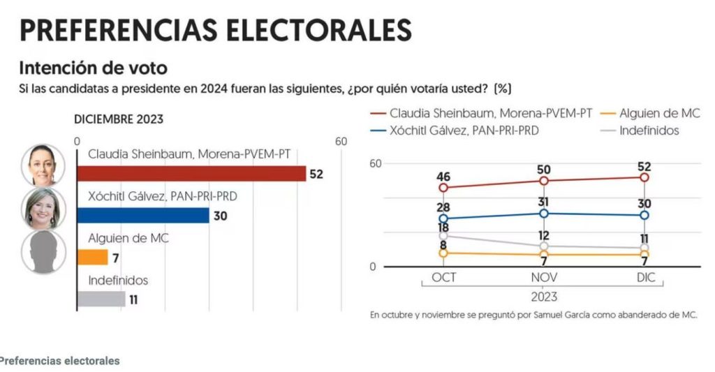 Claudia Sheinbaum, precandidata de Morena, lidera con un 52% de preferencias sobre Xóchitl Gálvez, del Frente opositor, que suma un 30%, según la encuesta nacional de El Financiero de diciembre. La ventaja aumentó 3 puntos desde noviembre.