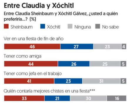 En otros aspectos, al preguntar a quién preferirían ver en una fiesta de fin de año, el 46% mencionó a Sheinbaum. Respecto a quién contaría mejores chistes, el 33% eligió a Sheinbaum y cuanto a preferencias personales, el 44% preferiría tener a la precadidata de Morena como amiga. Para jefa en el trabajo, el 41% opta por Sheinbaum, el 23% por Gálvez, y el 31% no prefiere a ninguna.