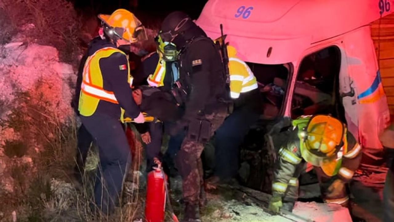 El impacto hizo que el responsable perdiera el control de su unidad, desviándose hacia la terracería. En la maniobra, uno de los contenedores volcó y prensó la cabina, causando fracturas en las piernas y el tórax del chofer.