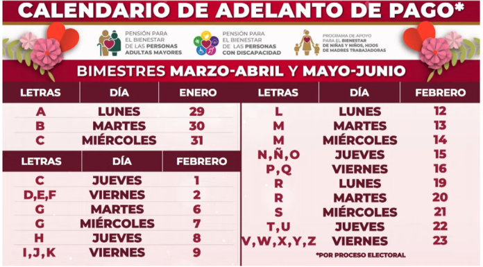 Cabe recordar que, los beneficiarios recibirán pagos adelantados durante el mes de febrero, esto por la veda electoral. Los dos pagos anticipados se realizarán en febrero, iniciando el proceso el 29 de enero y concluyendo el 23 de febrero