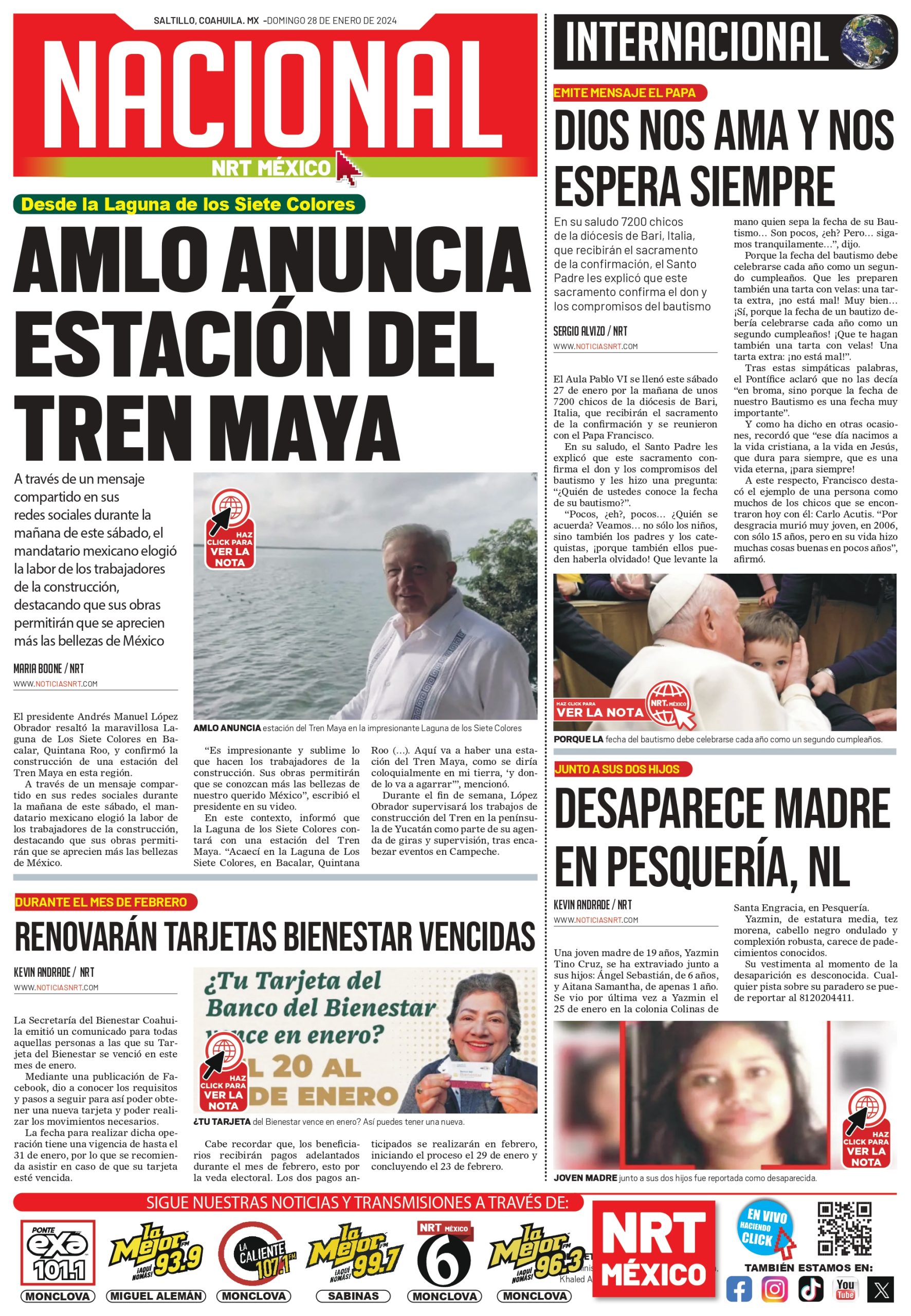Portada del 28 de enero de 2024 Por: Redacción 28/01/2024 FacebookXPinterestWhatsApp Portada del 28 de enero de 2024 En portada: AMLO anuncia estación del Tren Maya en la impresionante Laguna de los Siete Colores Publicidad NRT NRT México ya tiene canal de WhatsApp; únete desde tus dispositivos móviles y recibe las noticias más relevantes Relacionado TagsNRT MÉXICOPORTADA NRT MÉXICO FacebookXPinterestWhatsApp NOTAS RELACIONADAS LO MÁS RECIENTE Deportes Un total de 24 equipos de la NFL pudieron reforzarse en el primer día del Draft 23/04/2026 Deportes Acereros firma remontada épica y deja tendidos a Los Dorados 23/04/2026 Deportes Borrón y cuenta nueva Gato Ortiz estará en Chivas vs Tijuana junto con Katia Itzel García 23/04/2026 Frontera Frontera corona a su Reina de la Primavera 2026 en una noche de gala 23/04/2026 Frontera Frontera corona a su Reina de la Primavera 2026 en una noche de fiesta 23/04/2026