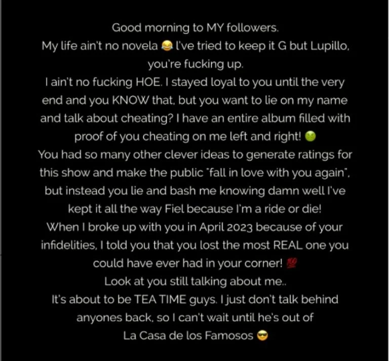 En respuesta, Giselle Soto utilizó su cuenta de Instagram para defender su lealtad y desafiar las acusaciones de Lupillo. Enfáticamente, declaró: “No soy una maldita zo**a. Me mantuve leal a ti hasta el final y lo sabes”.