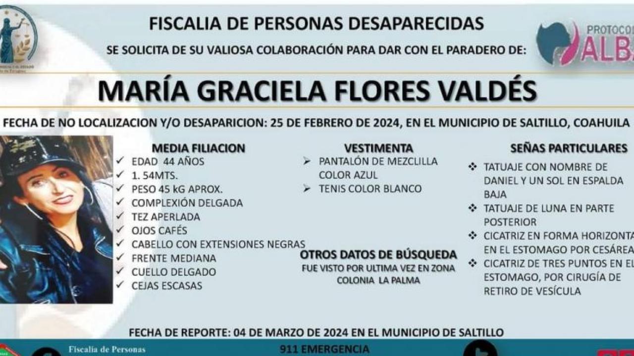 En Saltillo, María Graciela Flores Valdez, de 44 años y con adicción a las drogas, junto a su hija de 16 años, desaparecieron el 25 de febrero. La familia busca apoyo de las autoridades, emitiendo una ficha de búsqueda el 4 de marzo.