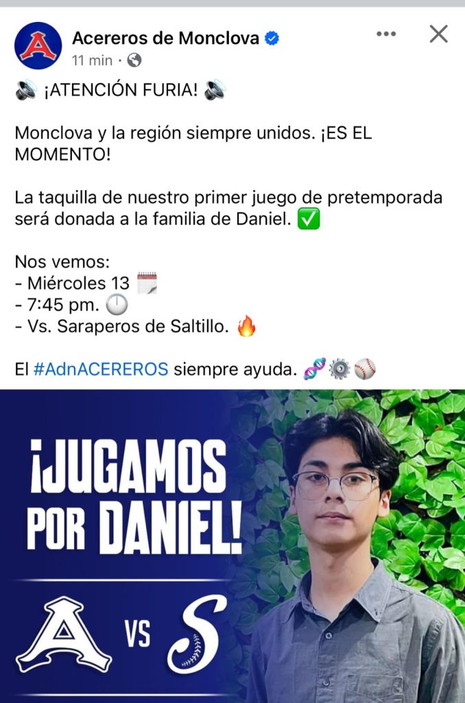 A través de redes sociales, en la cuenta oficial de Facebook ‘Acereros de Monclova’, se anunció que este próximo miércoles 13 de marzo arranca la pretemporada en el Horno Más Grande de México y se decidió que todo el recurso en boletaje se le entregará a la familia de Daniel.