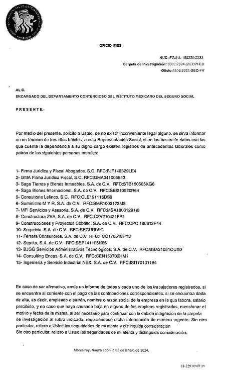 Este documento solicita información al Seguro Social sobre 15 empresas relacionadas con un presunto desvío de más de 200 millones de pesos. García argumentó que esto demuestra que la acusación en su contra es una invención de la Fiscalía, insinuando una campaña de difamación en su contra.