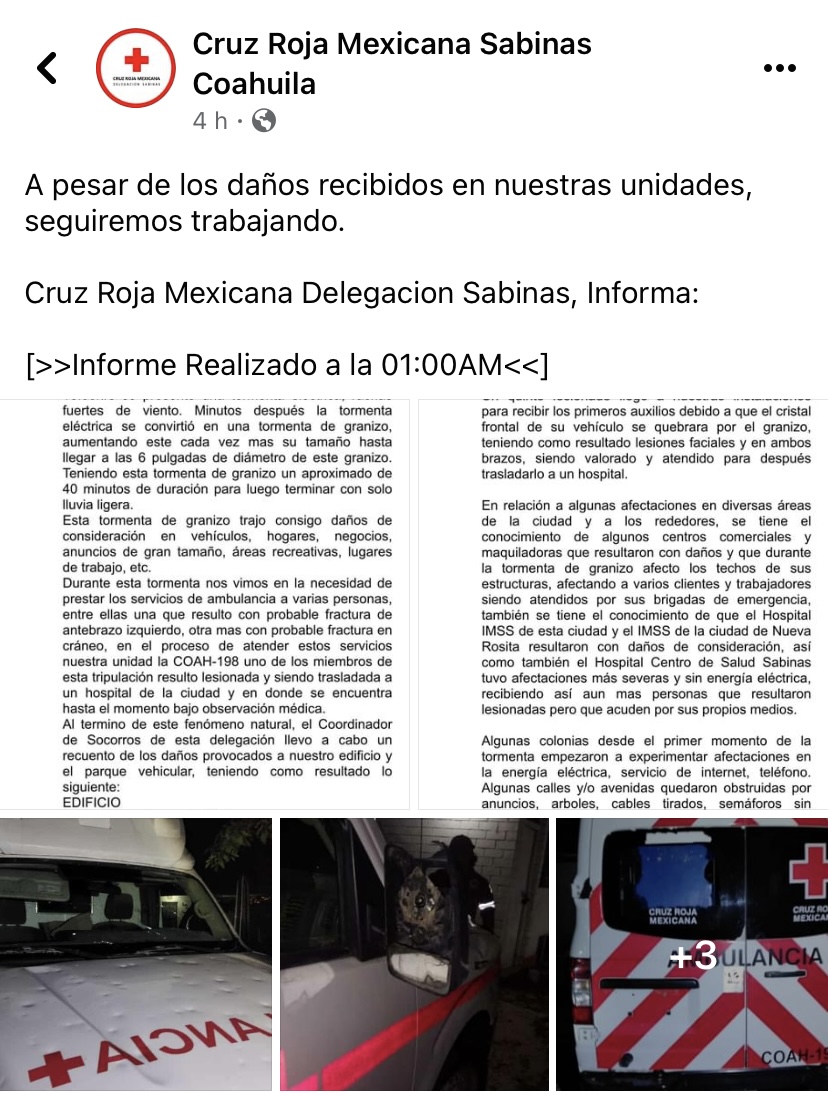 Mediante un comunicado emitido por el mismo cuerpo de la Delegación Sabinas se aclaró que incluso durante toda la tormenta que duró alrededor de 40 minutos, los servicios continuaron ya que su prioridad es brindar atención a toda la población en general, sobretodo en situaciones de riesgo.