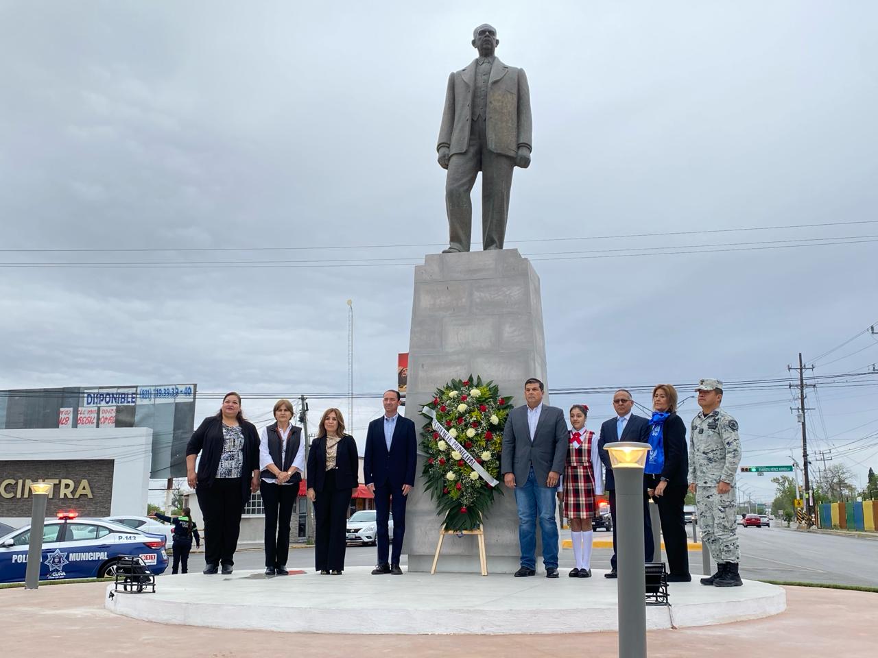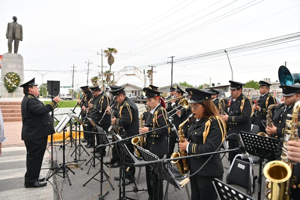 Ceremonia que se realizó frente al monumento al general Lázaro Cárdenas, con la presencia de alumnos de la primaria 18 de marzo, la escolta y banda de guerra del Colegio Nacional de Educación Profesional Técnica (CONALEP) y la Banda de Música Municipal.