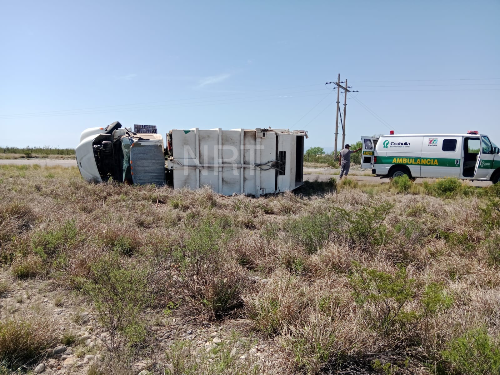 Un camión recolector de basura volcó en el kilómetro 72 de la carretera estatal 25, a la altura del capilla entre el entronque a Juárez y Presa Don Martín.