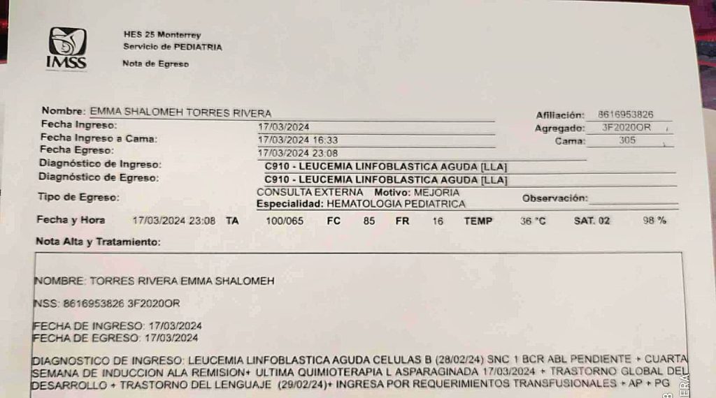 Su pequeñita, Emma, está internada en el hospital 25 del IMSS en Monterrey, Nuevo León, recibiendo tratamientos médicos por una enfermedad recién diagnosticada.