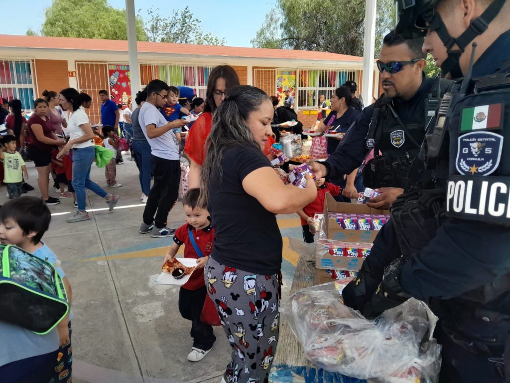 En Torreón, la Policía Metropolitana hizo presencia en la colonia Arenal, Moderna, Nazario Ortiz y Centro, donde la sonrisa en la niñez se hizo presente.