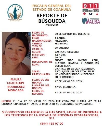 La menor, identificada como Maura Guadalupe Rodríguez Moncada, de 13 años de edad, fue vista por última vez en la colonia Chamizal el pasado 17 de mayo. Hasta ahora, su paradero es desconocido.