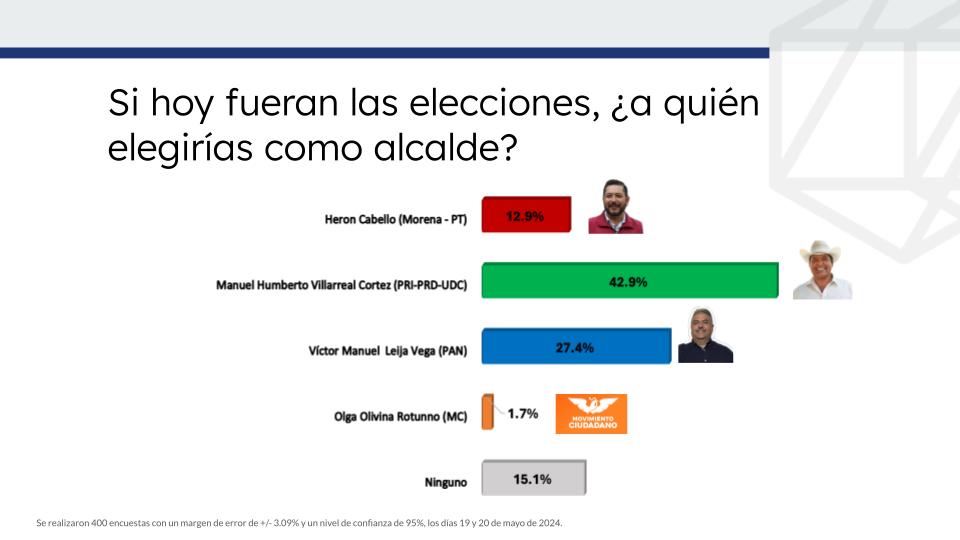 Los datos de la encuestadora de Demotecnia reflejan un estudio realizado a más de 400 personas de los días 19 y 20 de mayo reflejan que Humberto Villarreal ganaría la próxima elección con el 42.9% de la votación, más de 15 puntos por encima de su más cercano contendiente.