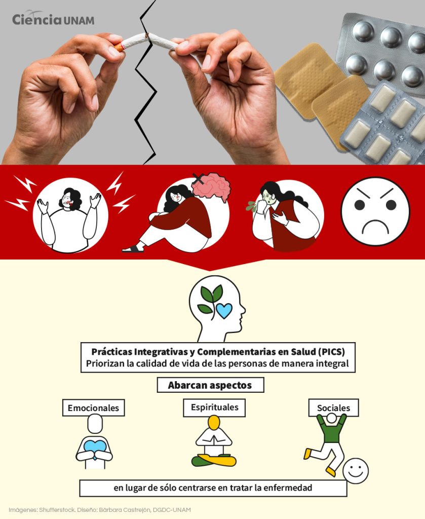 Existen estrategias terapéuticas para dejar de fumar, como parches, chicles, inhaladores y tratamientos farmacológicos. Las PICS (Prácticas Integrativas y Complementarias en Salud) buscan priorizar la calidad de vida de manera integral, considerando aspectos emocionales, sociales y espirituales.