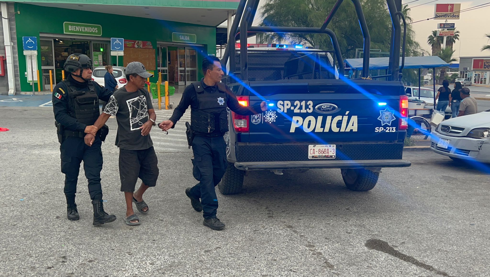 El hecho ocurrió minutos después de las 15:00 horas de este lunes, los guardias del comercio ubicado por bulevar Harold R. Pape pidieron la presencia de una patrulla acercándose oficiales de la Unidad SP213 y detuvieron al infractor.