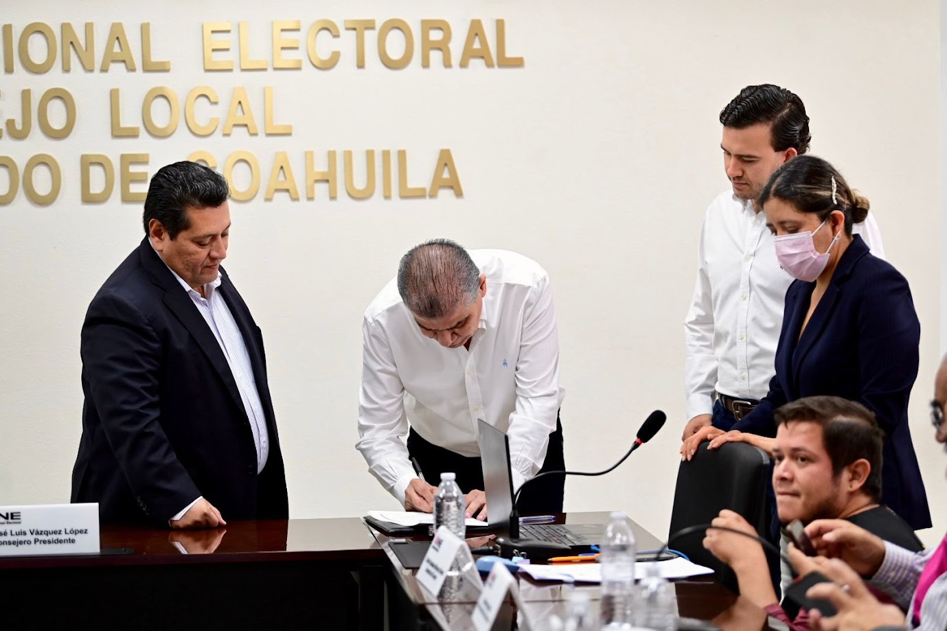 Miguel Ángel Riquelme Solís y su compañero de fórmula se convirtieron en legisladores electos propietario y suplente por Coahuila. El Instituto Nacional Electoral les entregó su constancia de mayoría.