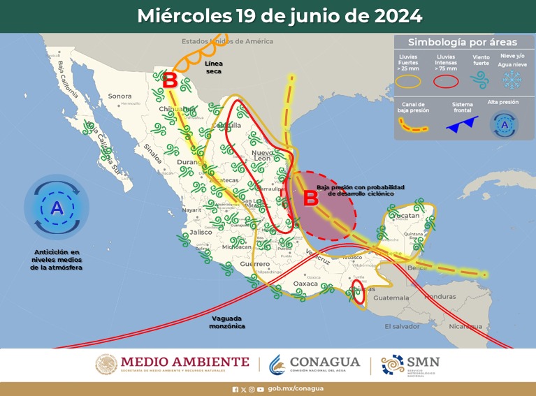 A partir del del de hoy lunes y los días martes y miércoles, de esta semana una baja presión que se encuentra en el golfo de México traerá la posibilidad de lluvias, mismas que podrían ser de moderadas a intensas acompañadas de tormentas eléctricas y viento con rangos de hasta 45km/h.