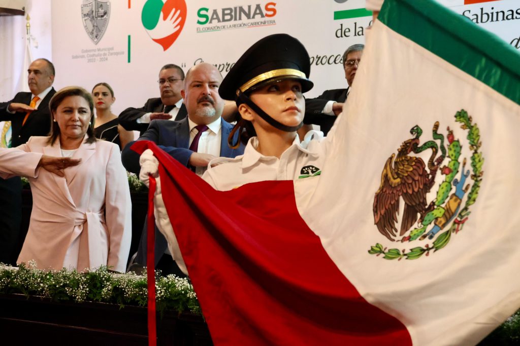 Se rindieron honores ala bandera con la participación de la escolta y banda de guerra del Colegio de Bachilleres de Coahuila (COBAC), con la entonación del himno nacional mexicano y el himno coahilense. A su vez, el profesor Ramiro Flores Morales, cronista municipal habló sobre la llegada de los fundadores, quienes planearon toda una estrategia que incluyó calles anchas, instituciones educativas, panteón, etcétera. Fue presentado el Credo a Sabinas por la jovencita estudiante del colegio Montessori, Valentina Alvarado Vargas a quien se le entregó un reconocimiento y, como siempre mantuvo a todos los asistentes emocionados con la exposición. Correspondió a Marcos Enrique Gómez Samaniego el agradecimiento al ayuntamiento por el reconocimiento del que fueron merecedores cuatro sabinenses y añadió que todos podemos aportar nuestro granito de arena para salir adelante en un municipio como el nuestro.
