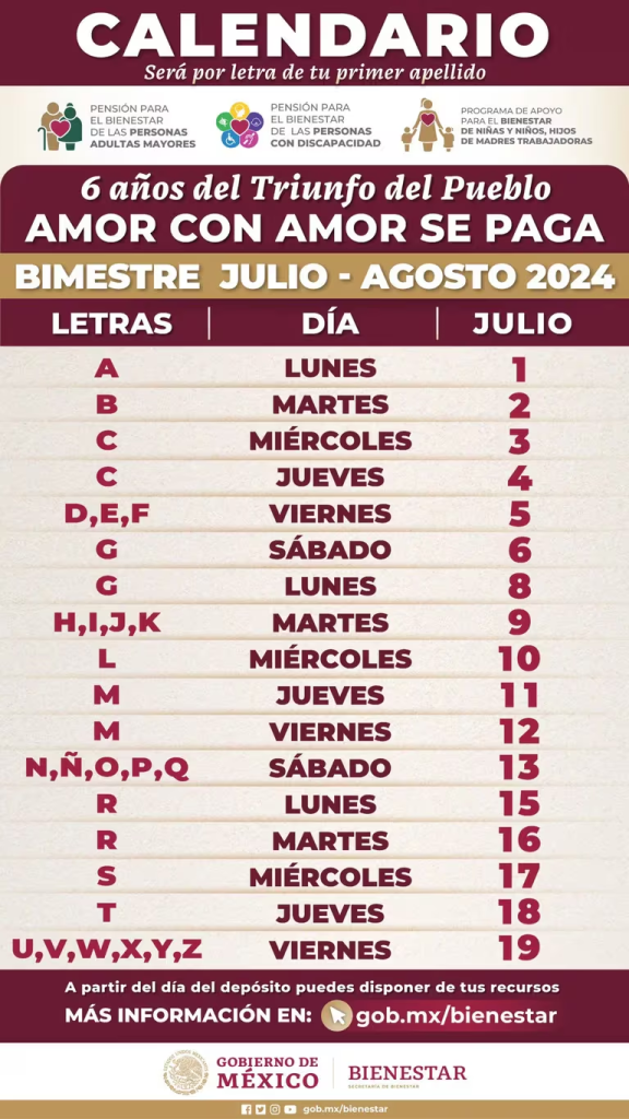 El sistema alfabético de pago asegura que todos los beneficiarios reciban su dinero de manera ordenada y sin problemas. Según el calendario oficial de la Pensión del Bienestar 2024, este viernes 5 de julio se efectuará el pago para aquellos con apellidos que inicien con D, E y F.