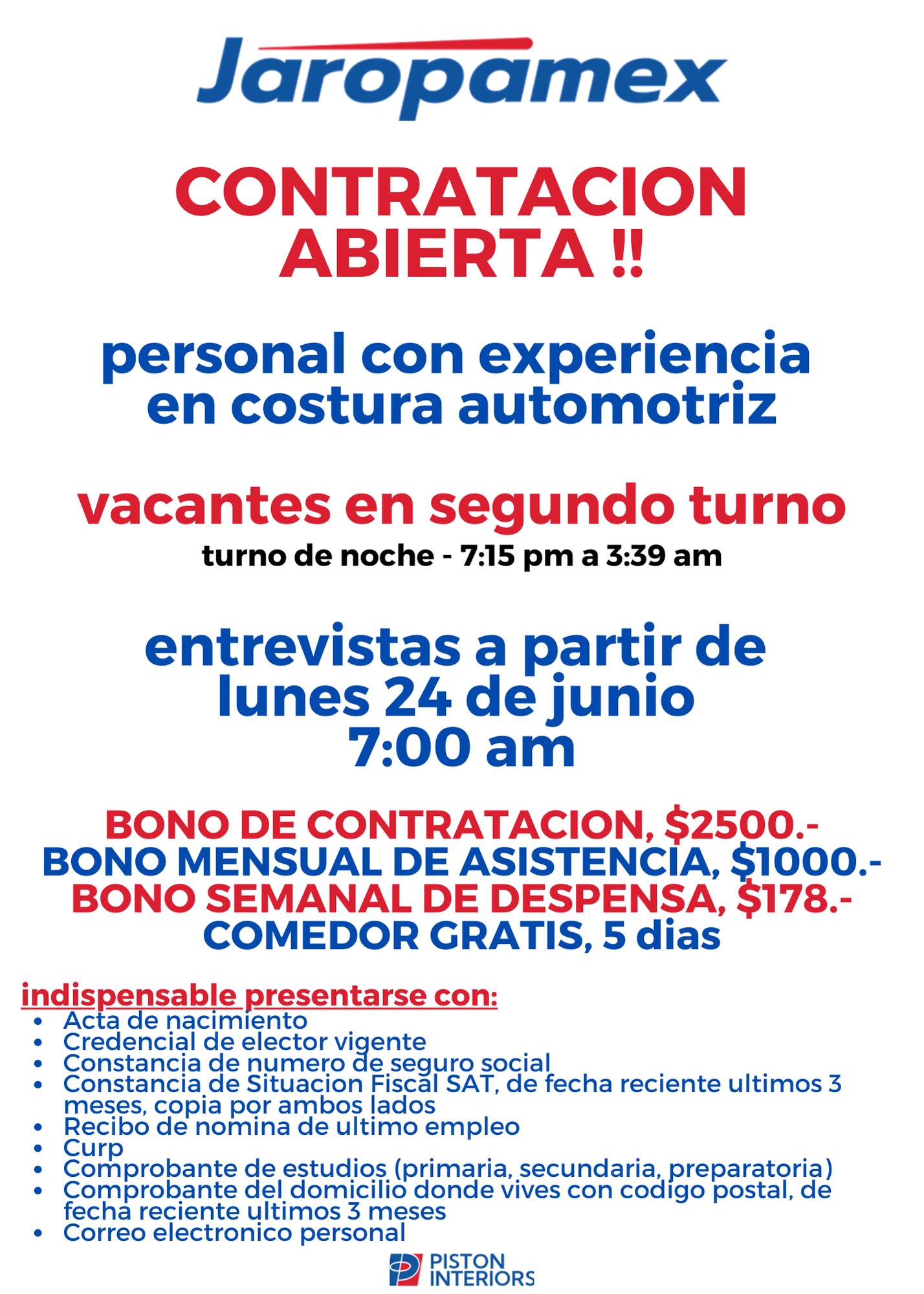 SABINAS,COAH.- Nuevas vacantes para personal con experiencia en costura en el segundo turno ha abierto la empresa maquiladora Jaropamex, ubicada en Sabinas.