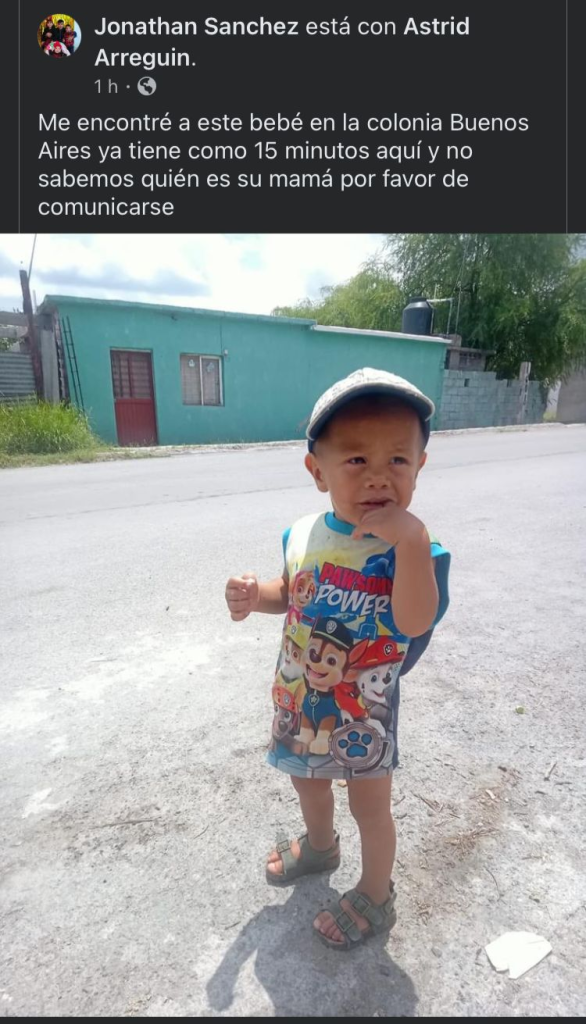 En redes sociales se reportó al mediodía de este martes 23 de junio que un niño fue encontrado en la colonia Buenos Aires alrededor de las 11:45 a.m. La identidad de la madre, así como la del menor, de aproximadamente un año y medio, es desconocida.
