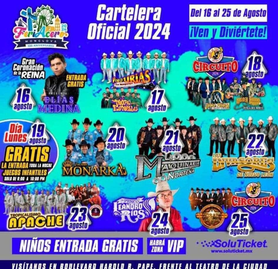 Mientras tanto, las autoridades han compartido un avance de la programación para las ferias de Monclova, que darán inicio el viernes 16 de agosto