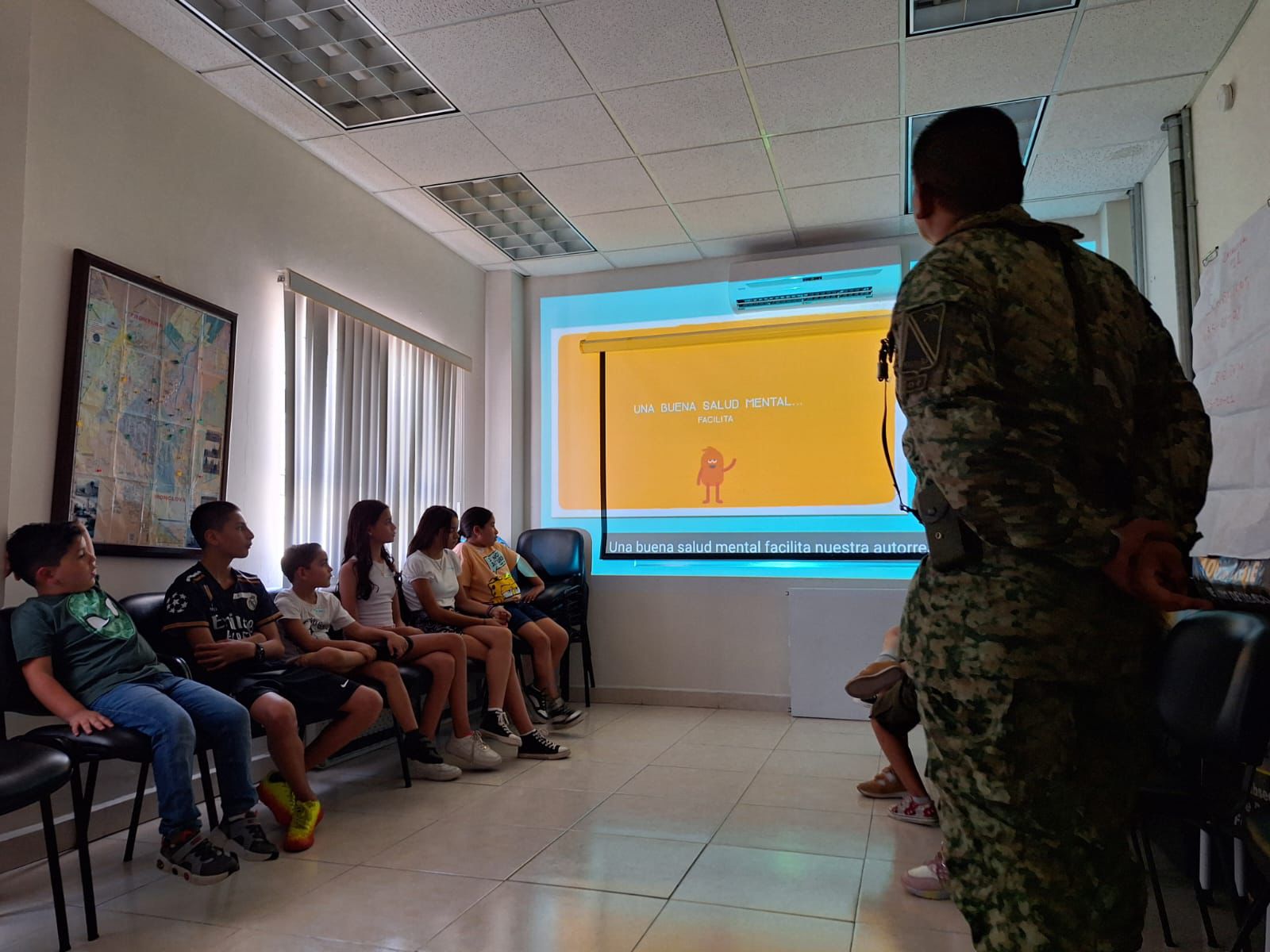 Como parte de las acciones de proximidad social, el Ejército Mexicano participó en las actividades del curso de verano del Centro Comunitario de Salud Mental, mostrando las actividades que realizan todos los días en favor de la población.