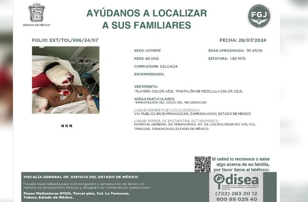 Un hombre con graves heridas fue encontrado en el municipio de Zumpahuacán, Estado de México. La Fiscalía General de Justicia del Estado de México (FGJ Edomex) ha emitido una alerta para localizar a sus familiares, ya que el hombre está hospitalizado en Tenancingo y no ha recuperado la conciencia.