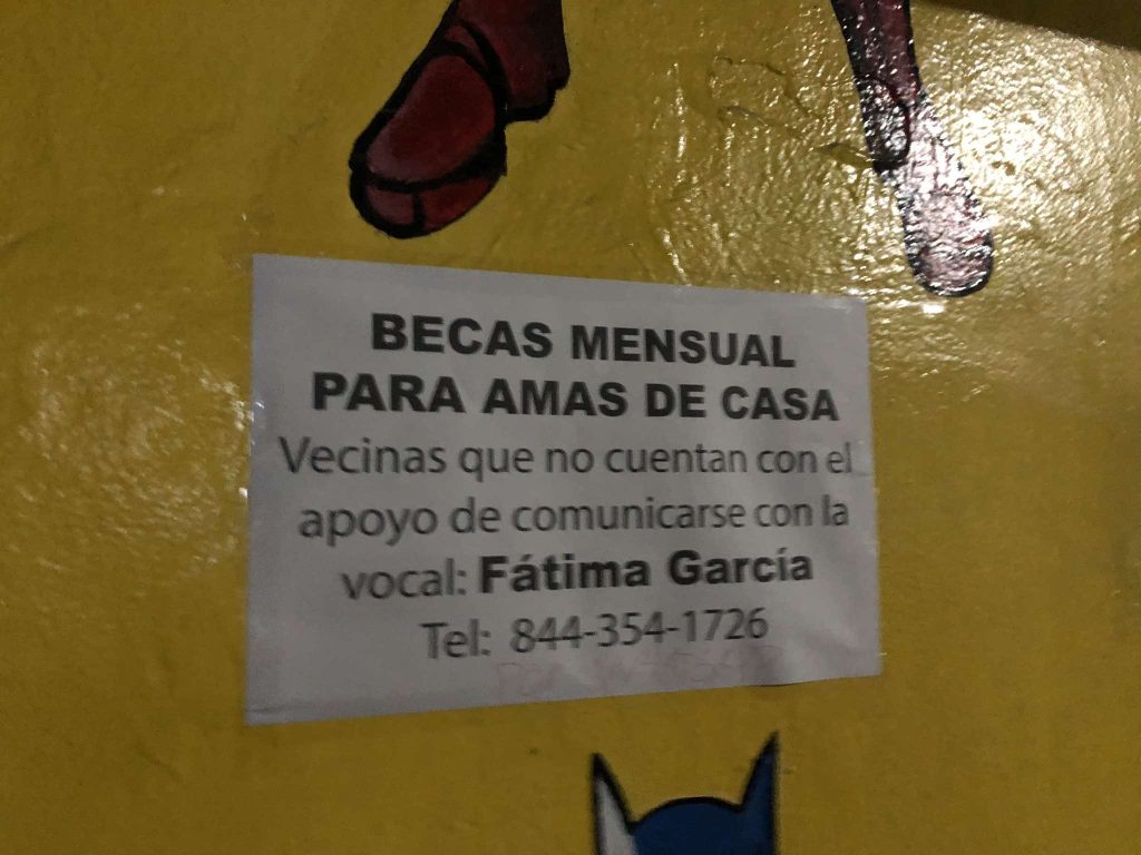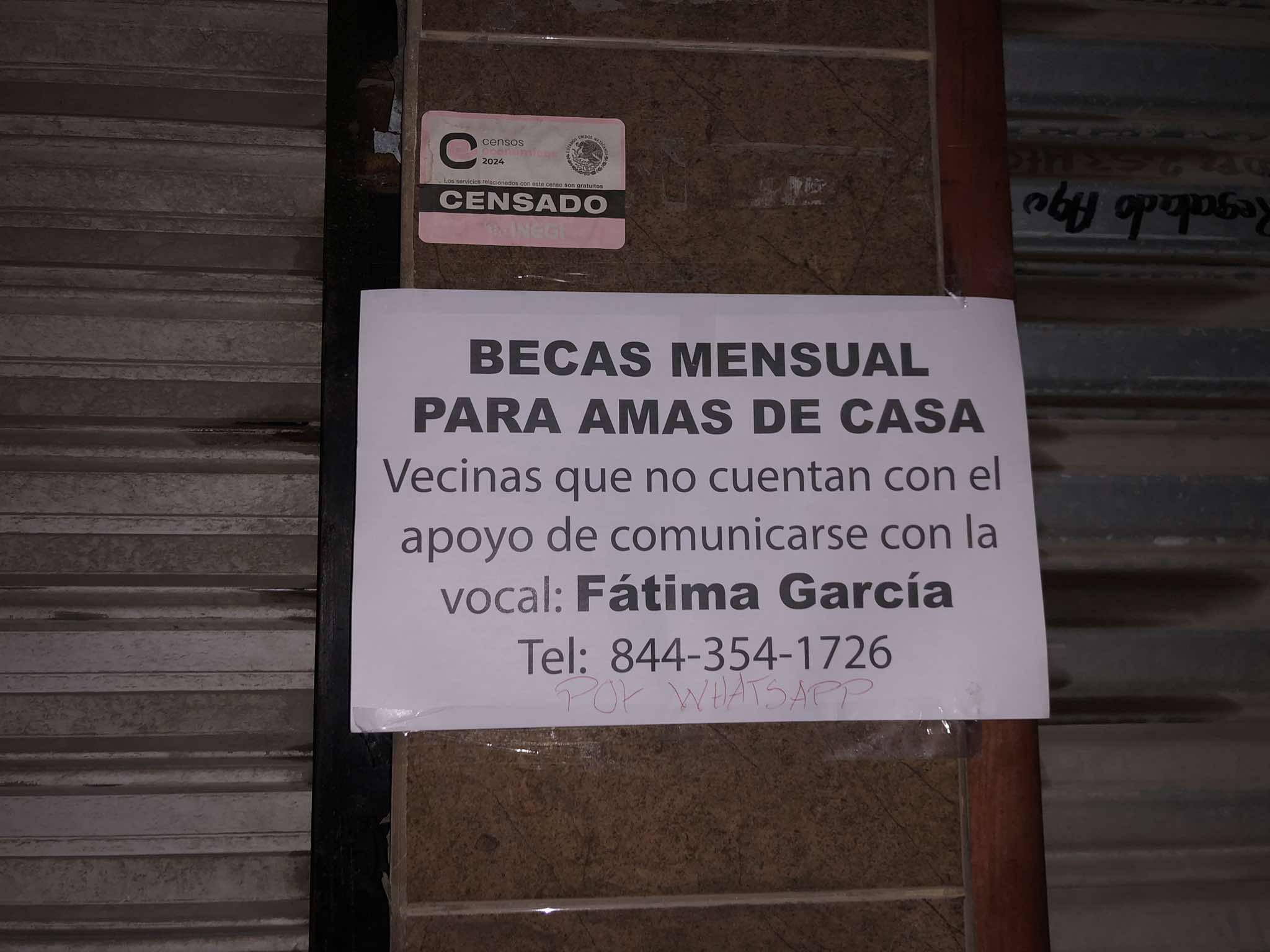 Mediante carteles informativos en diferentes puntos de la ciudad aparecieron estos anuncios que promueven becas para amas de casa en la avenida Madero, Zaragoza y Lamadrid entre otros puntos.