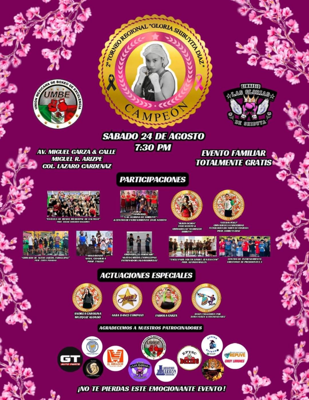 El Torneo de Box que se llevará a cabo será este sabado 24 de agosto a partir de las 7:30 de la tarde en la Av. Miguel Garza esquina con calle Miguel R. Arizpe en la colonia Lazaro Cárdenas el cual será un torneo totalmente gratuito abierto al público en general donde se podrá exponer el desarrollo de los jóvenes en este deporte.