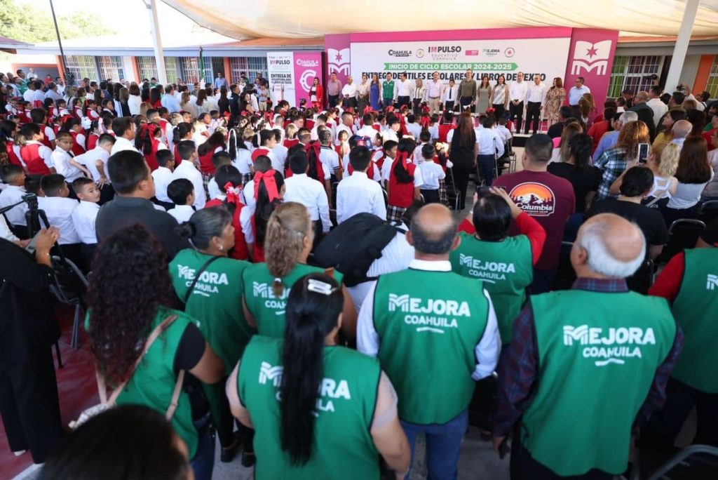 En la ceremonia con la que se puso en marcha el ciclo escolar 2024-2025 y con la que inició la entrega de más de 552 mil paquetes de útiles escolares y más de cuatro millones de libros de texto, el gobernador Manolo Jiménez Salinas reiteró su compromiso con las alumnas y alumnos de todos los niveles, así como con todo el sector educativo de Coahuila.