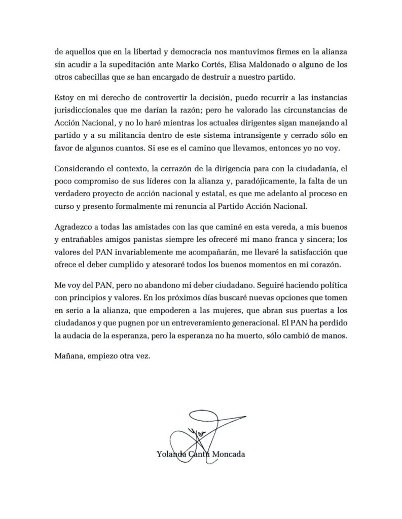 “Me voy del PAN, pero no abandono mi deber ciudadano”, afirmó Cantú, quien también adelantó que está evaluando nuevas opciones políticas que se tomen en serio las alianzas, empoderen a las mujeres y abran sus puertas a los ciudadanos.