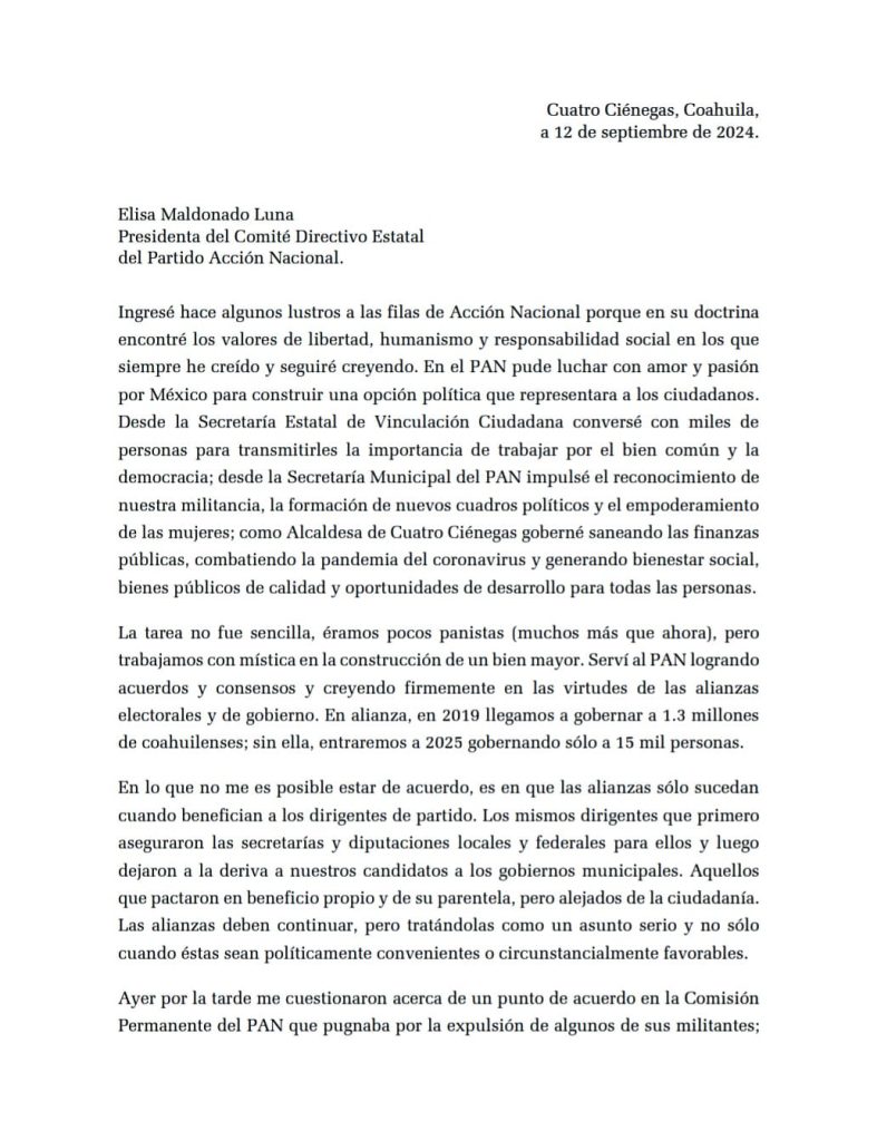 Yolanda Cantú, destacada panista y exalcaldesa de Cuatro Ciénegas, presentó su renuncia formal al Partido Acción Nacional (PAN), tras años de militancia y trabajo en la estructura del partido.