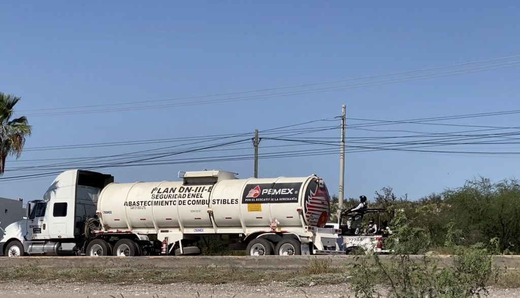 A lo largo de la carretera desde la refinería de Cadereyta Nuevo León y otros puntos, en convoy cada dia recorren varios estados las unidades y son custodiadas por agentes de la Guardia Nacional.