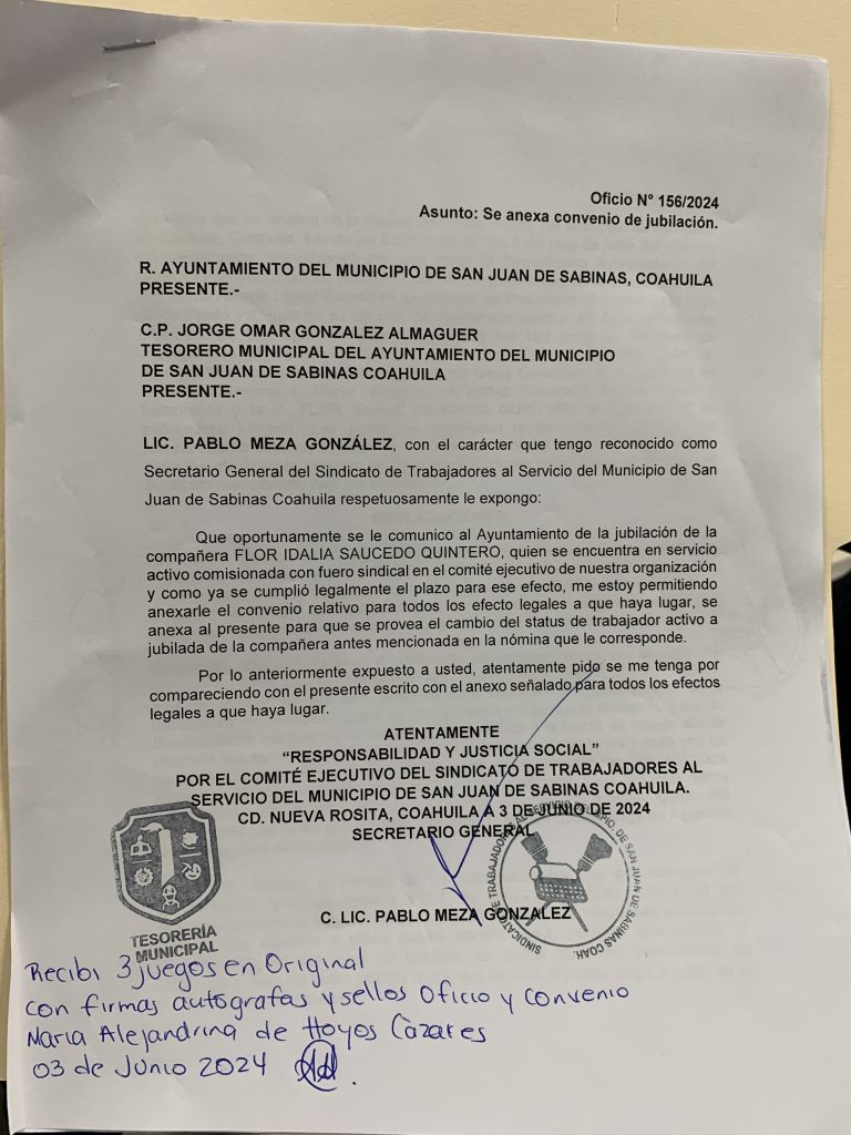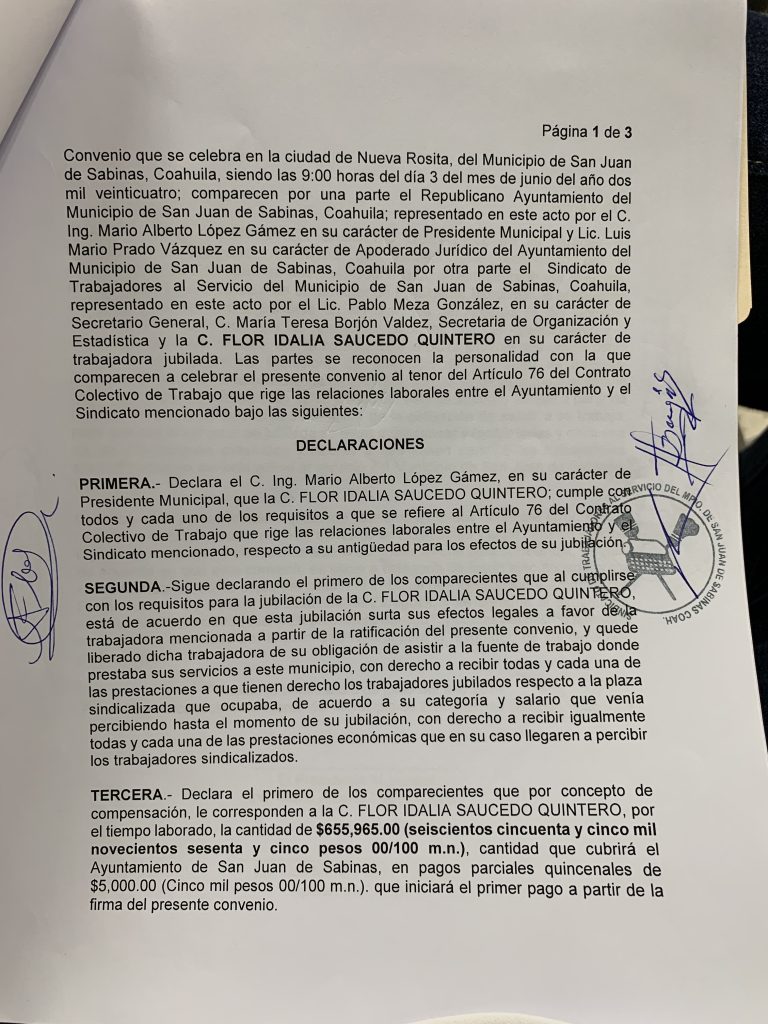 “Declara el primero de los comparecientes que por concepto de compensación, le corresponden a la C. FLOR IDALIA SAUCEDO QUINTERO, por el tiempo laborado, la cantidad de $655,965.00 (seiscientos cincuenta y cinco mil novecientos sesenta y cinco pesos 00/100 m.n.), cantidad que cubrira el Ayuntamiento de San Juan de Sabinas, en pagos parciales quincenales de $5,000.00 (Cinco mil pesos 00/100 m.n.). que iniciará el primer pago a partir de la firma del presente convenio” dice el convenio hecho a modo por Flor Idalia Saucedo el cual fue recibido pero no autorizado por la administración municipal por obvias razones.
