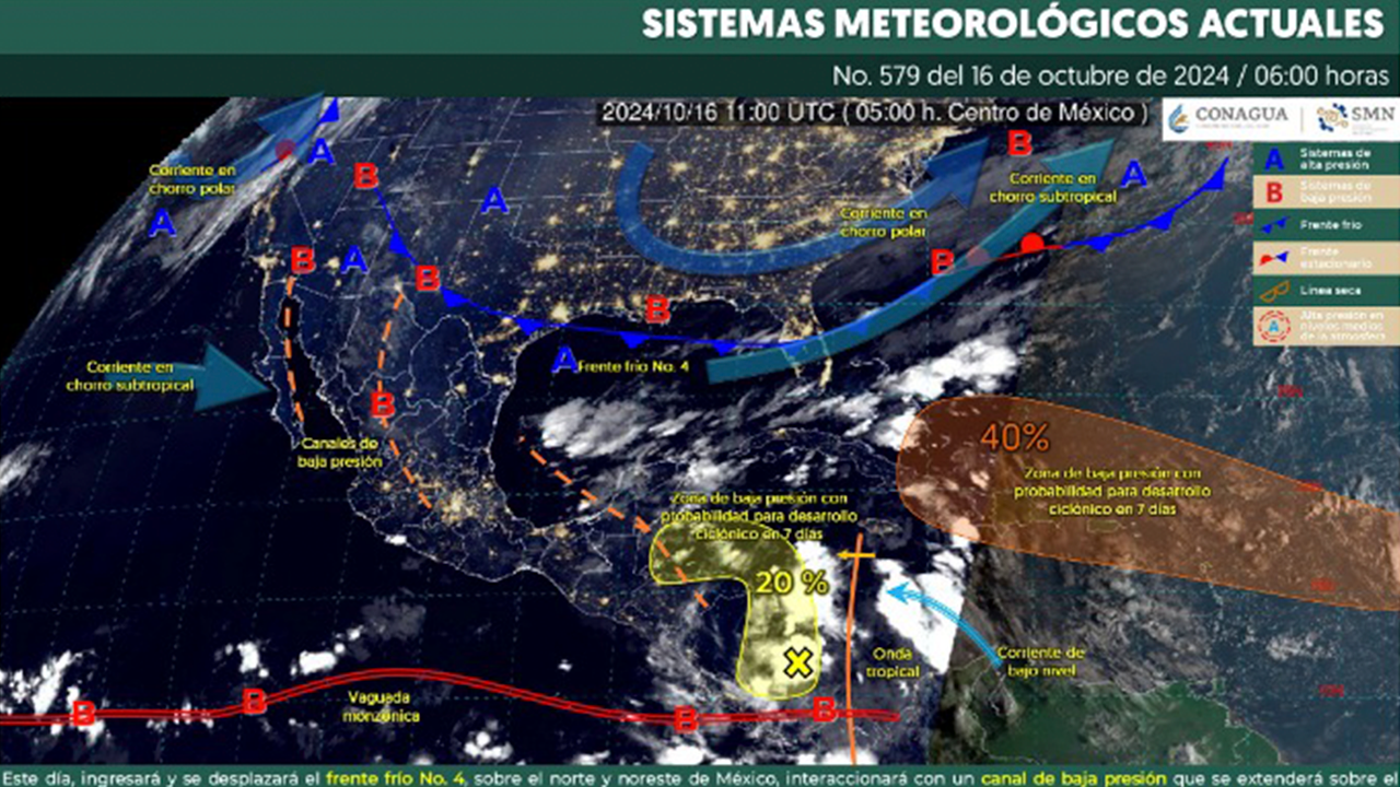 Según el pronóstico del Servicio Meteorológico Nacional, se esperan intervalos de chubascos y lluvias fuertes con acumulaciones de hasta 50 mm, lo que podría causar encharcamientos, inundaciones, deslaves e incrementar los niveles de ríos y arroyos.