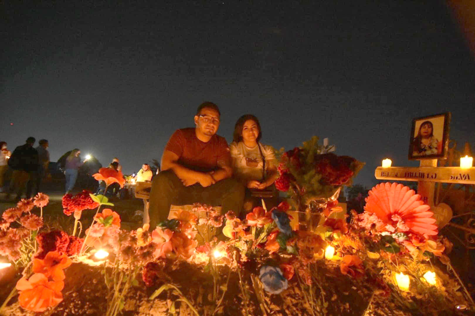 Además de las veladoras, se instalan catrinas monumentales que adornan el lugar, mientras familias enteras asisten para honrar a sus seres queridos con música, comida tradicional y flores.