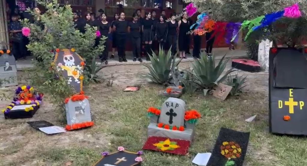 El tradicional altar de muertos se presentó ante autoridades, alumnos y maestros, además se agregaron elementos como la simulación de un cementerio y la interpretación de canciones alusivas a estas fechas.