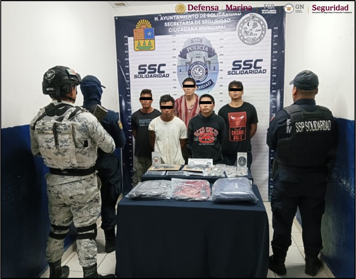 -En el municipio de Solidaridad, personal de la GN en coordinación con la Policía Municipal detuvo a cinco hombres y aseguró dos armas cortas, 26 cartuchos y diversas dosis de aparente marihuana.