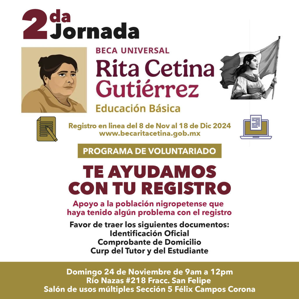 La jornada se realizará el próximo domingo 24 de noviembre, de 9:00 a 12:00 horas, en el Salón de Usos Múltiples Sección 5 Félix Campos Corona, ubicado en Río Nazas #218, fraccionamiento San Felipe. Se brindará ayuda gratuita en el escaneo de documentos, creación de correos electrónicos, registro en la plataforma oficial y entrega del acuse de registro impreso a color.
