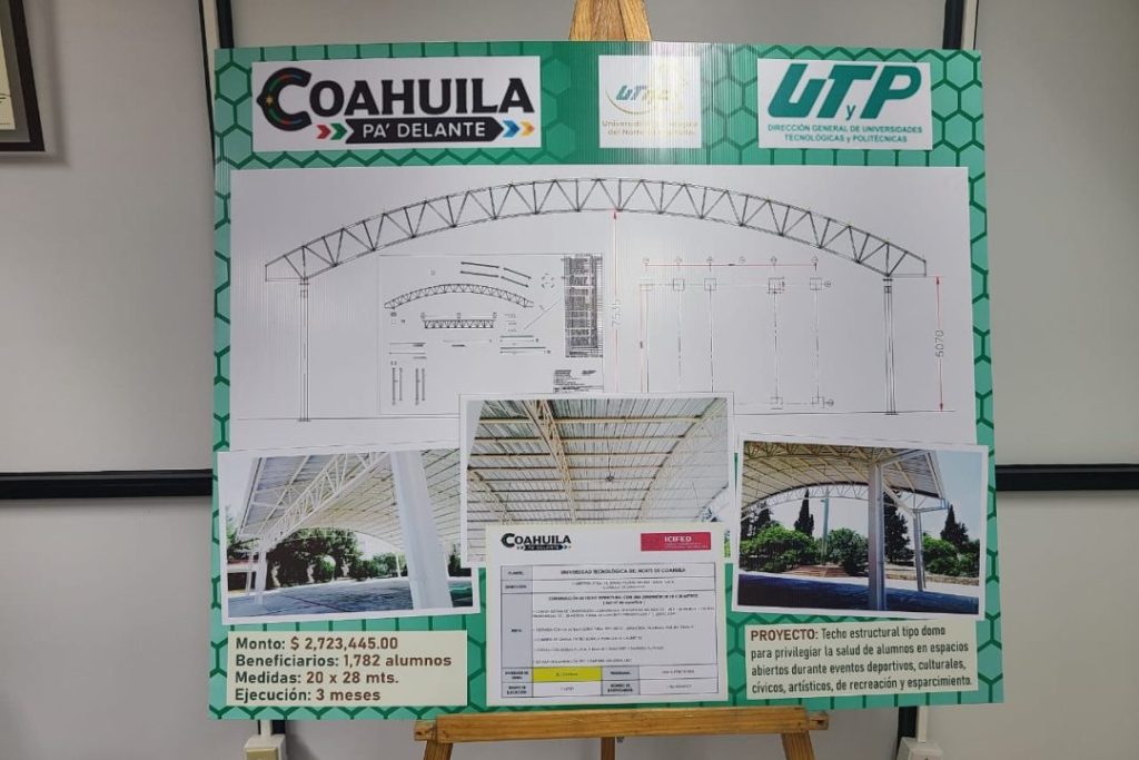 La Rectora de la Universidad Tecnológica del Norte de Coahuila, Esperanza Chapa señalo que ya se tiene un gran avance en lo que es la construcción del domo que cubrirá la explanada principal de la Universidad en el cual los alumnos podrán desarrollar mejor sus actividades deportivas, culturales y educativas.