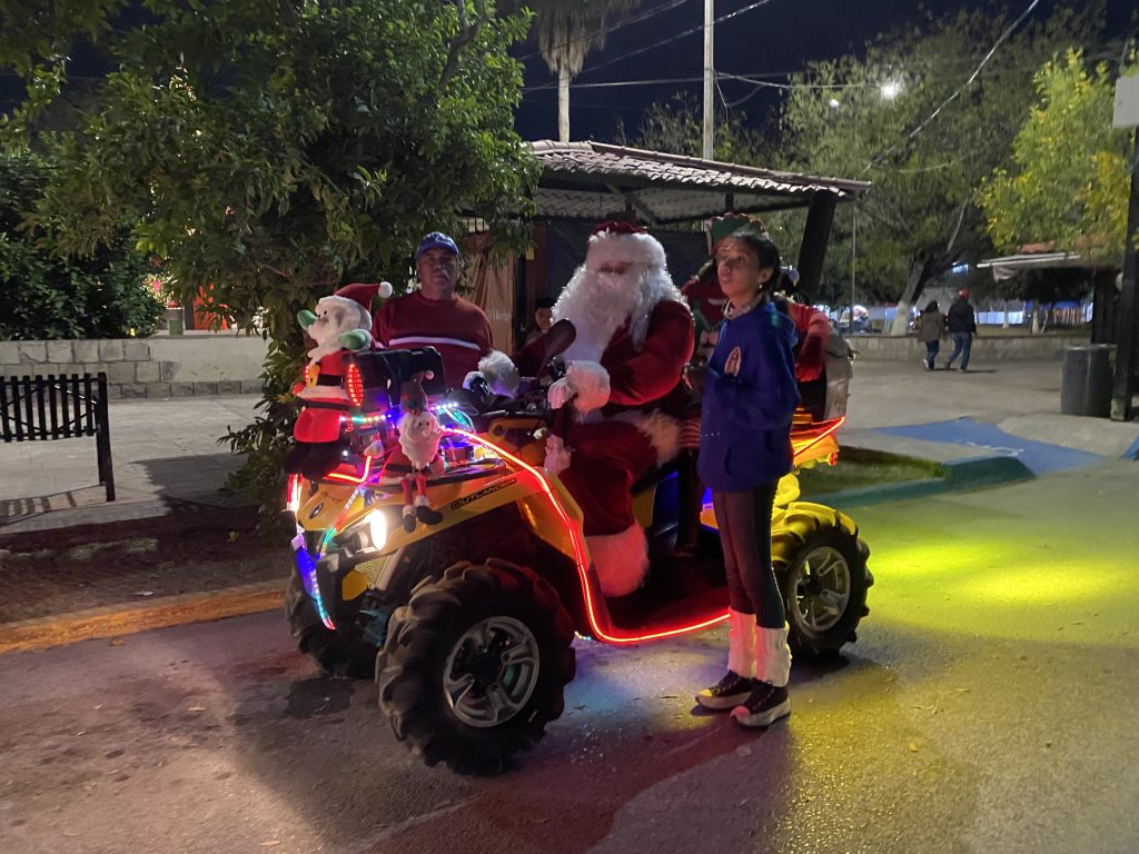 Aunque no viene en su trineo como en el Polo Norte, Santa llegó a Sabinas en su cuatrimoto para alegrar a chicos y grandes, en su recorrido, para quienes lo observan, no dejan pasar el momento para capturar una inolvidable fotografía del recuerdo.