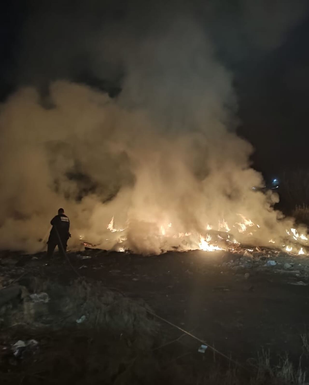 Personal del cuerpo de Bomberos Sabinas, durante la noche se movilizaron a la calle Zaragoza casi esquina con Nueces para luchar contra el fuego que aparentemente inició entre maleza y basura, que sirvió como combustible.