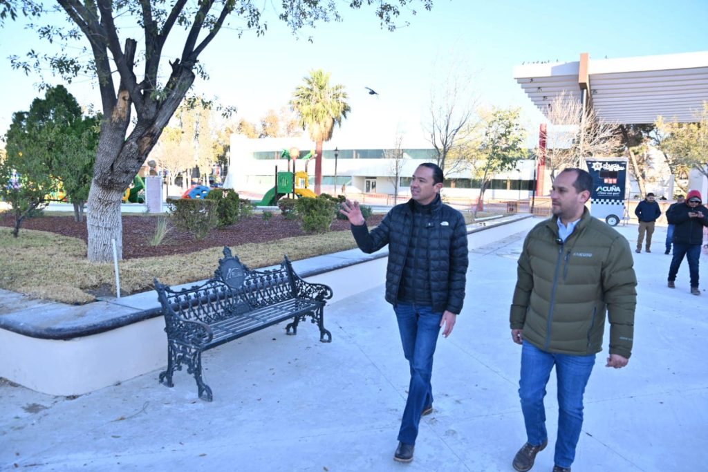 El presidente municipal Emilio de Hoyos y el director de Obras Publicas Carlos Flores Jiménez realizaron la supervisión de los avances de la plaza Benjamín Canales en Acuña.