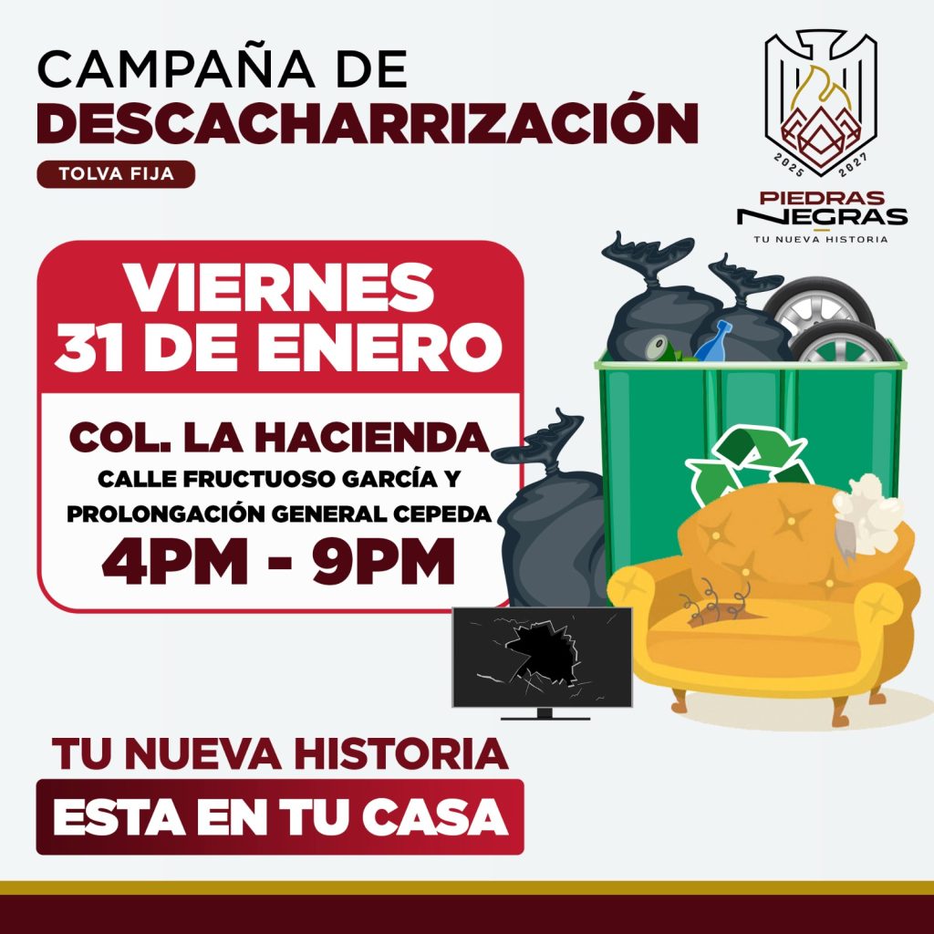 El Director de Imagen Urbana y Ecología, Alexis Gonzalez comento que como parte de las acciones para mantener la ciudad limpia y libre de criaderos de mosquitos, este viernes 31 de enero se llevará a cabo una jornada de descacharrización en la colonia La Hacienda.