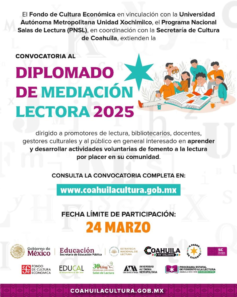 Con el objetivo de fortalecer el fomento a la lectura en comunidades, la Secretaría de Cultura de Coahuila ha abierto la convocatoria 2025 para el Diplomado en Mediación Lectora.