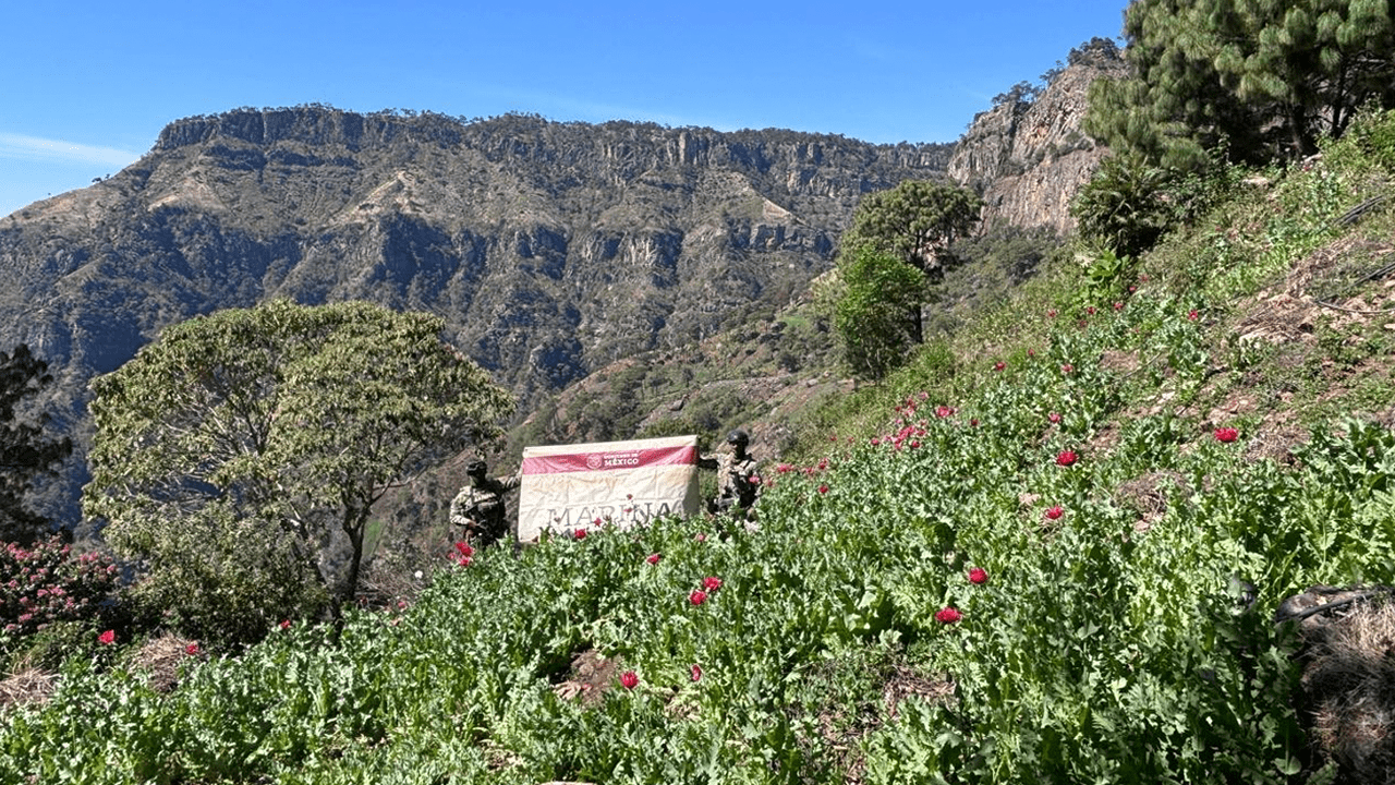 En Del Nayar, Nayarit, en inmediaciones del poblado Las Guacamayas, elementos de la Semar, derivado de información de inteligencia, localizaron y erradicaron siete plantíos de amapola en un área total de 31 mil 100 metros cuadrados con aproximadamente 703 mil plantas de amapola.