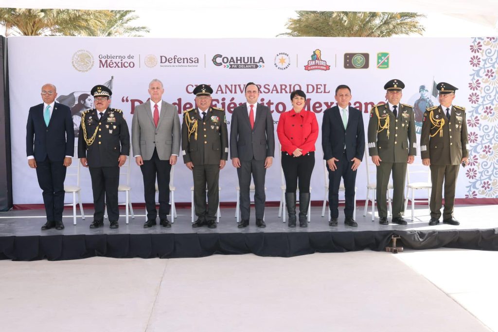 El gobernador Manolo Jiménez destacó que Coahuila es la cuna del Ejército Mexicano, recordando que fue en esta entidad donde Venustiano Carranza formó el Ejército Constitucionalista en 1913, el cual posteriormente evolucionó hasta convertirse en la institución que hoy protege la soberanía y el bienestar de México.