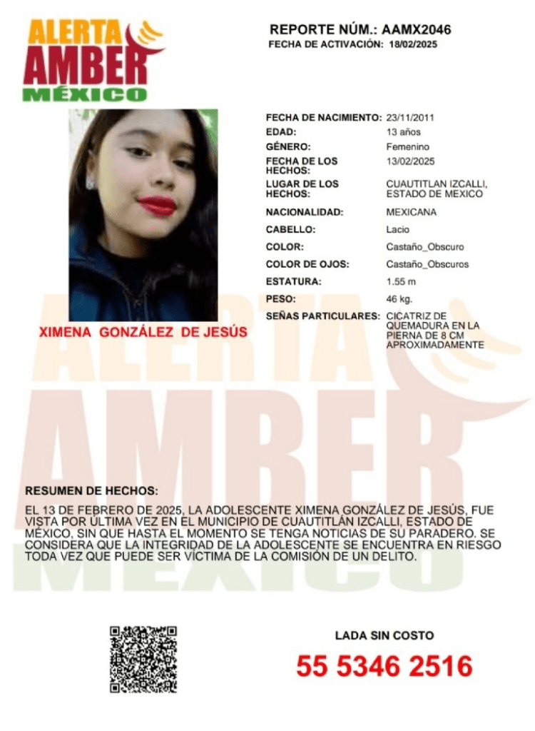 Ximena González de Jesús, una adolescente de 13 años, desapareció el 13 de febrero en Cuautitlán Izcalli, Estado de México. Su familia ha solicitado apoyo para localizarla y ha difundido su ficha de búsqueda, además de activar la Alerta Amber.