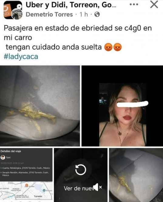 Un conductor de transporte por aplicación en Torreón, Coahuila, denunció que una pasajera en estado de ebriedad ensució su vehículo y no se hizo cargo de la limpieza. El caso se hizo viral en redes sociales, donde el chofer compartió lo ocurrido.