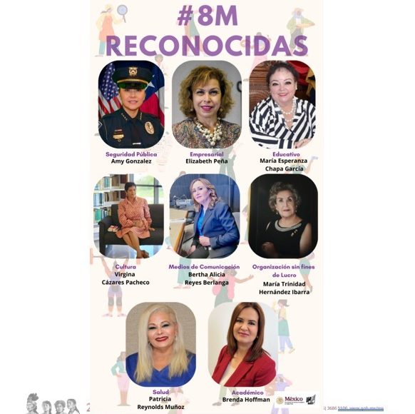 El 8 de marzo conmemora la lucha por la igualdad efectiva de los derechos para las mujeres en varios ámbitos por lo que el Consulado celebra el empoderamiento femenino y reconocerá el trabajo y dedicación de ocho mujeres destacadas en diferentes ámbitos en la ciudad de Eagle Pass y Piedras Negras quienes han demostrado su compromiso y liderazgo en beneficio de la comunidad transfronteriza.
